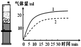 5、选择题 将一个土豆(含有过氧化氢酶)切成大小和厚薄相同的若干片,放入盛有一定体积和浓度的过氧化氢溶液的针筒中(如图所示)。若土豆片为4片时,在温度为35℃的条件下,每隔5分钟收集一次数据,并绘制出如图曲线1。利用同样的实验装置,改变某条件后,收集数据可绘制出曲线2。则改变的条件是?