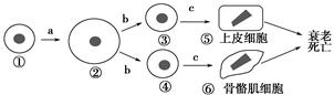 2、选择题 下图为人体某个细胞生命历程各个阶段示意图,图中①~⑥为各个时期的细胞,a~c表示细胞所进行的生理过程。据图分析,下列叙述不正确的是( )。