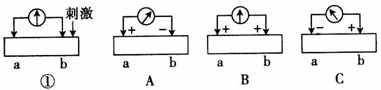 (1)在蛙的坐骨神经表面放置两个电极,连接到一个电表上(电表指针偏转方向代表电流方向)。静息时,电表没有测出电位差(如下图中①所示)。若在图①所示神经右侧的相应位置给予一适当的刺激,则电流表指针偏转的顺序依次为B→____。