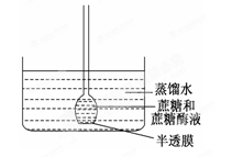 4、选择题 下图装置的玻璃槽中是蒸馏水,半透膜允许单糖透过。倒置的长颈漏斗中先加入蔗糖溶液,一定时间后再加入蔗糖酶。最可能的实验现象是 ?