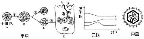 2、连线题 下列三幅图中:图中甲表示动物干细胞进行的一系列生理过程,乙表示哺乳动物乳腺细胞合成并分泌乳腺蛋白过程中生物膜面积变化,丙为流感病毒,请据图回答问题: