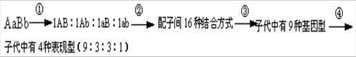 4、选择题 下图为基因型AaBb的生物自交产生后代的过程,基因的自由组合定律发生于