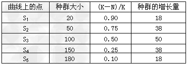 3、选择题 资源的合理使用是使产量最大化,又不影响资源的持久利用。自然种群增长呈“S”型线。假设种群的最大值K=200,N表示种群数量水平,根据下表,下列说法正确的是: