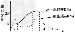 5、选择题 下图表示洋葱根尖某细胞不同时期细胞核中DNA和细胞质中mRNA的含量变化。下列有关说法正确的是