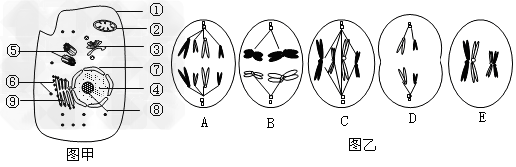 2、连线题 图甲是高等动物细胞亚显微镜结构示意图,图乙是某一动物体内5个不同时期细胞的示意图。请据图回答以下问题: