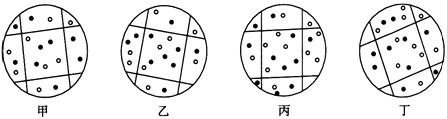 4、连线题 水稻的粳性与糯性是一对相对性状,由等位基因A、a控制。已知粳性花粉遇碘呈蓝紫色,糯性花粉遇碘呈红褐色。某生物小组同学获得了某一品系水稻的种子,为了较快地鉴定出这种水稻的基因型,他们将种子播种,开花后收集大量成熟花粉。将多数花粉置于载玻片上,滴加1滴碘液,盖上盖玻片,于光学显微镜下观察到呈蓝紫色和呈红褐色的花粉粒。下图表示在同一载玻片上随机观察到的4个视野中花粉粒的分布状况(黑色圆点表示蓝紫色花粉粒,白色圆点表示红褐色花粉粒)。