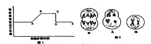 3、选择题 下图1表示某种生物细胞分裂的不同时期与每条染色体DNA含量变化的关系;图2表示处于细胞分裂不同时期的细胞图像。以下说法正确的是