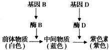 2、选择题 香豌豆能利用体内的前体物质经过一系列代谢过程逐步合成蓝色中间产物和紫色素,此过程是由B、b和D、d两对等位基因控制(如下图所示),两对基因不在同一对染色体上。其中具有紫色素的植株开紫花,只具有蓝色中间产物的开蓝花,两者都没有的则开白花。下列叙述中,错误的是