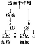 4、选择题 下图表示淋巴细胞的起源和分化过程(其中a、b、c、d表示不同种类的细胞,①②表示有关过程),下列有关叙述正确的是
