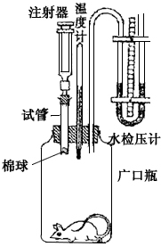 ②.将每只小白鼠分别放入以上装置的广口瓶中,待动物适应测定环境和瓶内的温度稳定后,然后用注射器(5mL)向广口瓶内注入5mL空气,记录水检压计右侧液面下降单位刻度所需时间t1。