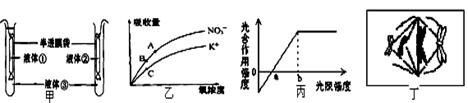 本题解析:试题分析:因为①的浓度高于②,所以溶剂水从②进入①,含液体①的半透膜袋坚挺变硬。②的浓度高于③,所以溶剂水从3进入②,含液体③的半透膜袋萎缩。故①>②>③,A错。植物细胞吸收离子的方式是主动运输,故影响A、B两点和B、C两点吸收量不同的因素分别是能量、载体数量,B错。丙图中,a点表示光合速率等于呼吸速率时的光照强度,为提高产量,应使a点左移,C错。