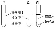 (3)将小麦种子分别置于20℃和30℃培养箱中培养4天,依次取等量的萌发种子分别制成提取液Ⅰ和提取液Ⅱ。取3支试管甲、乙、丙,分别加入等量的淀粉液,然后按下图加入等量的提取液和蒸馏水,45℃水浴保温5分钟,立即在3支试管中加入等量斐林试剂并煮沸2分钟,摇匀观察试管中的颜色。结果能呈砖红色的试管是________,其中颜色较浅的是________。