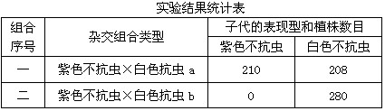 2、填空题  棉花的纤维有白色的,也有紫色的;植株有抗虫的也有不抗虫的。为了鉴别有关性状的显隐性关系,用紫色不抗虫植株分别与白色抗虫植株a、b进行杂交,结果下表所示。假定控制两对性状的基因独立遗传;颜色和抗虫与否的基因可分别用A、a和B、b表示,请回答: