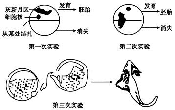 (1)1928年,德国学者施佩曼做了一个实验:他用较细的婴儿头发将蝾螈的受精卵结扎成两个半球状,其中的一个半球中含灰新月区和细胞核,另一个不含这个区带。结果前者发育成了胚胎,后者则不能。即使后者含有细胞核,细胞也不能分化,只能发育成没有一定形状的团块。该实验说明了_________。