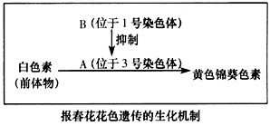 3、连线题 报春花的花色表现为白色(只含白色素)和黄色(含黄色锦葵色素),这对相对性状由两对等位基因(A和a,B和b)共同控制,显性基因A控制以白色素前体物合成黄色锦葵色素的代谢过程,但当显性基因B存在时可抑制其表达(生化机制如下图所示)。