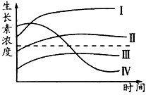 4、选择题 将一盆栽植物横放于地上,则其水平方向的茎的近地侧生长素浓度变化曲线为(图中虚线表示对茎的生长既不促进也不抑制的生长素浓度)