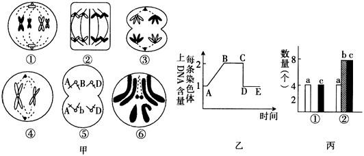 (2)如果图丙中①→②完成了图乙中AB段的变化,则图丙a、b、c中表示染色体的是__________。图甲中细胞④产生的子细胞内,a、b、c的数量分别为__________。