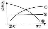 5、选择题 三条曲线中分别表示当环境温度从25℃降到3℃时,小白鼠体内甲状腺激素含量、尿量及酶活性变化情况的为