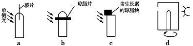 2、选择题 如下图所示,a、b、c为对胚芽鞘做不同处理的实验,d为一植株被纸盒罩住,纸盒的一侧开口,有单侧光照,下列对实验结果的描述,正确的是