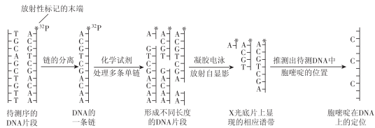 3、选择题 化学降解法是一种传统的测定DNA碱基序列的方法。特定化学试剂的处理能使DNA单链在某种特定碱基处断开,且每条链只在一处断开;利用凝胶电泳可将不同长度的DNA片段彼此分离,通过放射自显影可使带标记的DNA片段在X光底片上显现出相应谱带。下图为测定已标记后的DNA片段中胞嘧啶位置的过程示意图。下列叙述正确的是