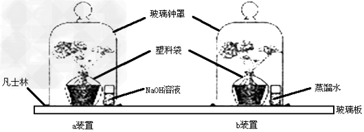5、选择题 下图为探究CO2是否为植物光合作用原料的实验装置示意图。其中a为实验装置,b为对照装置。有关用塑料袋扎紧花盆的实验设计思路是