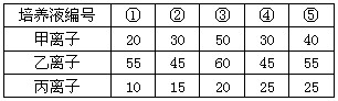 1、选择题 某植物培养液中含有甲、乙、丙3种离子,它们对植物的生长都有影响。下表列出的5种培养液中,甲、乙、丙3种离子的浓度(单位:mmol/L)不同。为了研究丙离子的浓度大小对植物生长的影响,进行实验时可以选用的两种培养液是
