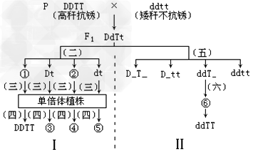 4、连线题 现有两纯种小麦,一纯种小麦性状是高秆(D),抗锈病(T);另一纯种小麦的性状是矮秆(d),易染锈病(t)(两对基因独立遗传)。育种专家提出了如图Ⅰ、Ⅱ两种育种方法以获得小麦新品种,问: