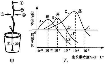 (2)将该植物置于左侧光照下,一段时间后,乙图中的_____点的浓度可表示甲图④处的生长素浓度。