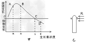 4、选择题 下图甲表示不同浓度生长素溶液对胚芽鞘生长的影响。如果图乙胚芽鞘受到单侧光照射后测得b处生长素浓度为m,a处的生长素浓度为X,则