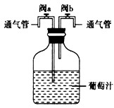 2、选择题 小李尝试制作果酒,他将葡萄汁放入已灭菌的发酵装置中进行试验(见下图),恰当的做法是