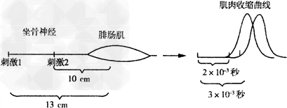 (4)德国科学家Mellor的学生用蛙的坐骨神经一腓肠肌标本做了一个非常简单的实验(如下图),从而测量出坐骨神经的冲动传导速度。