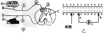 (3)乙图是甲图①的一段,如果在电极a的左侧给一适当刺激,当产生的兴奋传到a点时,a、b之间的电流方向是__________;电流计c的指针会发生两次________(填“相同”或“相反”)方向的偏转。