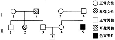 2、选择题 已知人红绿色盲属X染色体隐性遗传,先天性耳聋是常染色体隐性遗传(D对d完全显性)。下图中Ⅱ2为色觉正常耳袭患者,Ⅱ5为听觉正常色盲患者。Ⅱ4(不携带d基因)和Ⅱ3婚后生下一个男孩,这个男孩患耳聋、色盲、既耳聋又色盲的可能性分别是