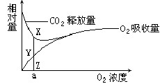 1、选择题 下图表示的是某植物的非绿色器官呼吸时O2 的吸收量和CO2 的释放量之间的相互关系,其中线段XY=YZ。则在氧浓度为a时有氧呼吸与无氧呼吸