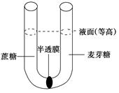 5、选择题 如图所示U形管中间被一种允许水分子通过而单糖、二糖不能透过的半透膜隔开,现在两侧分别加入0.1 mol/L的蔗糖溶液和麦芽糖溶液,一段时间后左右两侧液面高度变化是怎样的?若向U形管右侧加入某种微量物质(不影响溶液浓度),右侧液面高度上升,那么加入的这种微量物质最可能是