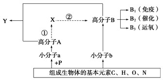 3、连线题 下图表示人体内几种化学元素和化合物的相互关系,其中a、b表示有机小分子物质,A、B、X代表有机高分子物质,虚线表示遗传信息的流动方向。据图分析回答下列问题: