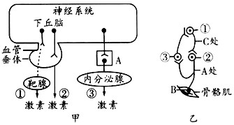 4、连线题 图甲中①②③表示神经系统对内分泌功能调节的三种方式。图乙中①②③都是兴奋性神经元,肌肉细胞在受到适宜的刺激后,也和神经细胞一样能引起细胞膜电位的变化,图中B处表示神经肌肉接头,其结构和功能与突触类似。据图分析回答: