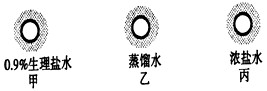 5、选择题 人体红细胞呈两面凹的圆饼状,具有运输氧气的功能。将人体红细胞分别放在甲、乙、丙三种不同的液体中,一段时间后可能出现的现象是