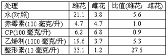 2、选择题 丝瓜为雌雄同株异花植物,将刚萌动的该植物种子先在下表5种物质一定浓度的溶液泡24小时,然后种植。比较最初10节的雌花与雄花平均数,求出性别比,实验观察结果