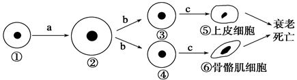 1、选择题 如图为人体细胞的分裂、分化、衰老和死亡过程示意图,图中①~⑥为各个时期的细胞,a~c表示细胞所进行的生理过程。据图分析,下列叙述正确的是( )