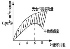 4、选择题 下图所示叶面积指数与光合作用和呼吸作用的关系(叶面积指数是指单位土地面积上植物叶面积的数量。此值越大,表示植物叶片交错程度越大)。图中阴影部分表示的生理过程和森林合理开采的叶面积指数分别为