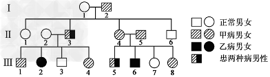 1、选择题 某家系中有甲、乙两种单基因遗传病(如下图),其中一种是伴性遗传病。相关分析正确的是
