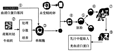 2、连线题 人的血清白蛋白(HAS)在临床上需求量很大,通常从血液中提取。但由于艾滋病病毒等的威胁与日俱增,使人们对血液制品顾虑熏重。如果应用现代生物科学技术,将人的血清白蛋白基因导入奶牛细胞中,那么利用牛的乳汁生产血清白蛋白就会安全、高效地满足人类需求。下图是利用牛奶乳汁生产人类血清白蛋白的图解,根据下图回答: