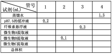 实验材料:三种微生物(A~C)培养物的纤维素酶提取液,提取液中酶蛋白浓度相同。