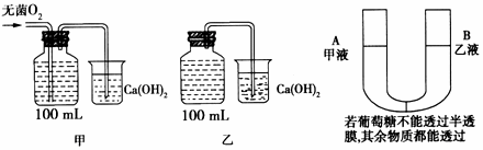 5、选择题 各取10%的无菌葡萄糖溶液100mL,加入少许酵母菌液,混匀、密封,按如图装置实验。如果测定甲、乙装置中CaCO3沉淀均为10g,撤去装置,将两瓶溶液用滤菌膜过滤掉酵母菌,滤液分别倒入如下U形管中,开始时液面相平,下列对一段时间后A、B液面变化及其原因的叙述正确的是
