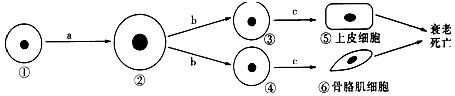 2、选择题 下图为人体细胞的分裂、分化、衰老和死亡过程的示意图,图中①—⑥为各个时期的细胞,a~c表示细胞所进行的生理过程。据图分析,下列叙述正确的是