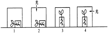 5、连线题 将培养在琼脂培养基内的蚕豆幼苗,分别放入4个暗箱中,如下图所示。其中第2和第4个暗箱分别在顶部和右侧开孔,使光线射入,请分析回答: