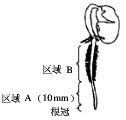 1、综合题 为了探究不同的浓度生长素对根生长的影响,假设生长素能促进根的生长,且浓度越高,促进作用越强。实验方案:将小麦种子浸润萌发,如下图所见,根部正在发展,从区域A剪取10mm长的根段。配制不同浓度的生长素溶液,在每一种溶液中放人相同数量的根段,浸泡两天。