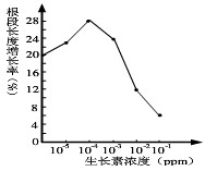 实验方案:从区域A和区域B各剪取10mm长的根段,分别等量地浸泡于10-4μg/g(或10-5μg/g、10-3ppm)浓度的生长素溶液中2天,测量根段的长度,计算平均值。