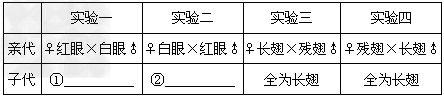 2、填空题 下表是四组关于果蝇眼色和翅形遗传的杂交实验。已知眼色遗传属于伴X染色体遗传,且实验一的红眼雌果蝇是显性纯合子(XAXA);果蝇的翅形由等位基因B、b控制。